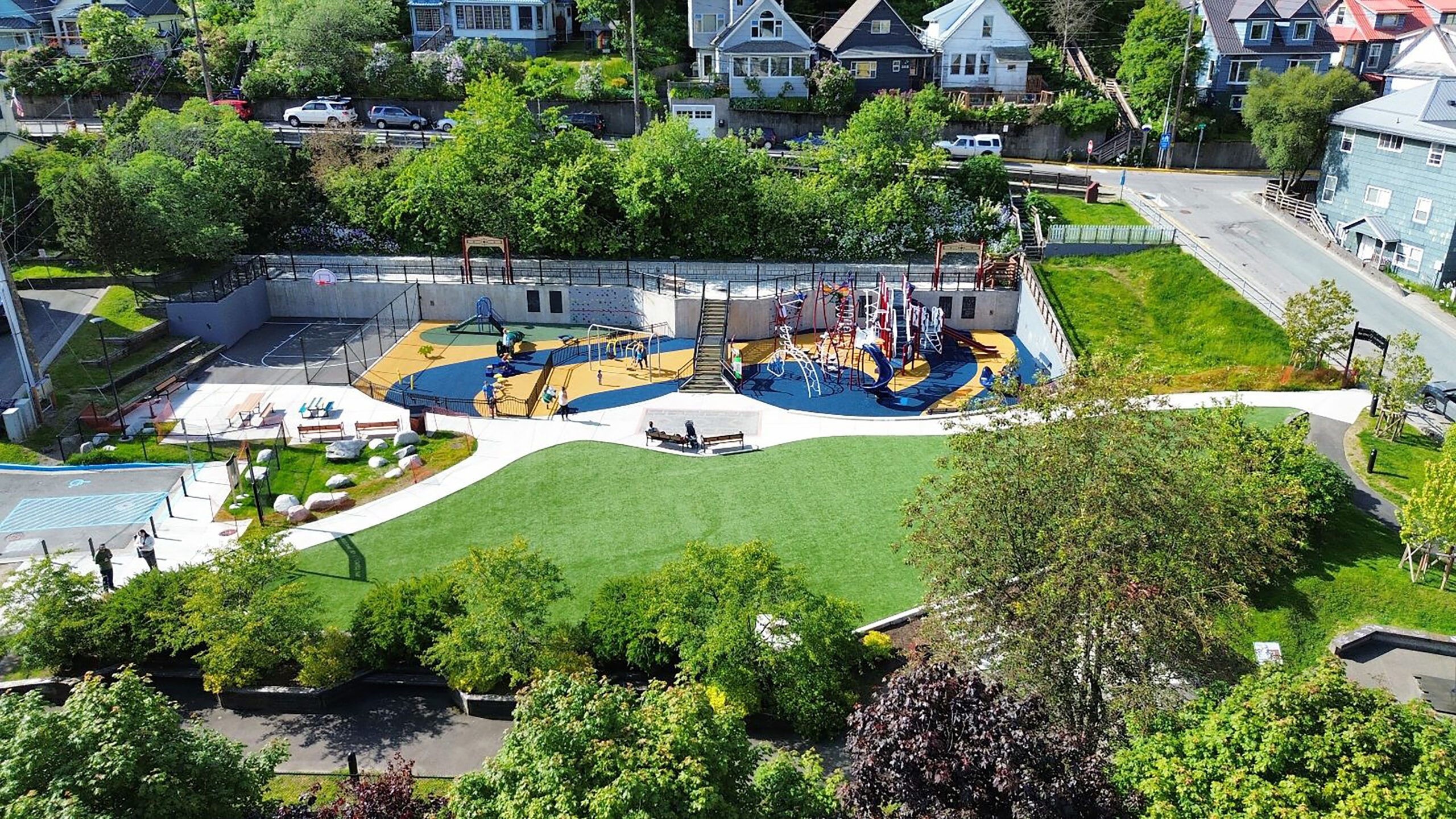 MRV Architects partnered with Anderson Land Planning, PND and Gorman Engineers for comprehensive upgrades to Capitol School Park. In addition to upgrades, the park needed new hillside retention and overall site drainage. The design takes advantage of the hillside retention, using the new retaining wall as part of the “playloops”, or circulation for the playground areas. The central staircase and observation benches take advantage of the terrain for an engaging play area. This allowed the flatter portions of the park to become a large south facing open turf area. The lower portions of the park were preserved with mature vegetation and the empty chair memorial.